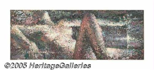 <B>Kelly Freas - Reclining Nude Painting Original Art (undated).</B></I> This work is an acrylic on masonite painting. The image area of the pointillistic figure study is 13.25" x 5", and the painting was signed at the lower left. The art is in Excellent condition.