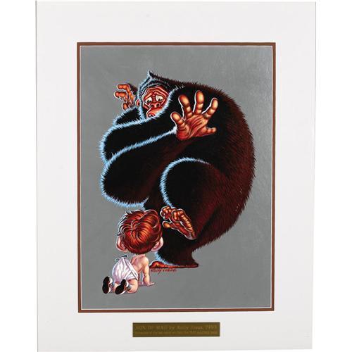 <B>Kelly Freas - "Son Of Mad" Paperback Book Cover Recreation Painting Original Art (1993).</B></I> Kelly Freas had a long, illustrious career as an illustrator of science fiction book covers, but for many of his fans, his humorous covers for <B>Mad</B></I> can't be topped. In 1959, Freas created one of his best efforts for the cover to the sixth collection of Mad paperback reprints, <B>Son of Mad</B></I>. It featured a fantastically funny take-off on "King Kong" (and the sequel, "Son of Kong"), as a scared-to-death Kong encounters a baby Alfred E. Neuman! What, me worry, indeed! The original art for this priceless treasure has long since vanished, but in 1993, collector/dealer Bruce Hamilton commissioned Freas to recreate his cover, which we are now pleased to offer. The gouache on board painting measures 13" x 18", and is matted and framed to an overall size of 21" x 26". In Excellent condition. <I>From the Estate of Bruce Hamilton.</B></I><BR><BR><b>Shipping:</b> Framed (<a target="_blank" href="http://www.heritageauctions.com/common/shipping.php">view shipping information</a>)