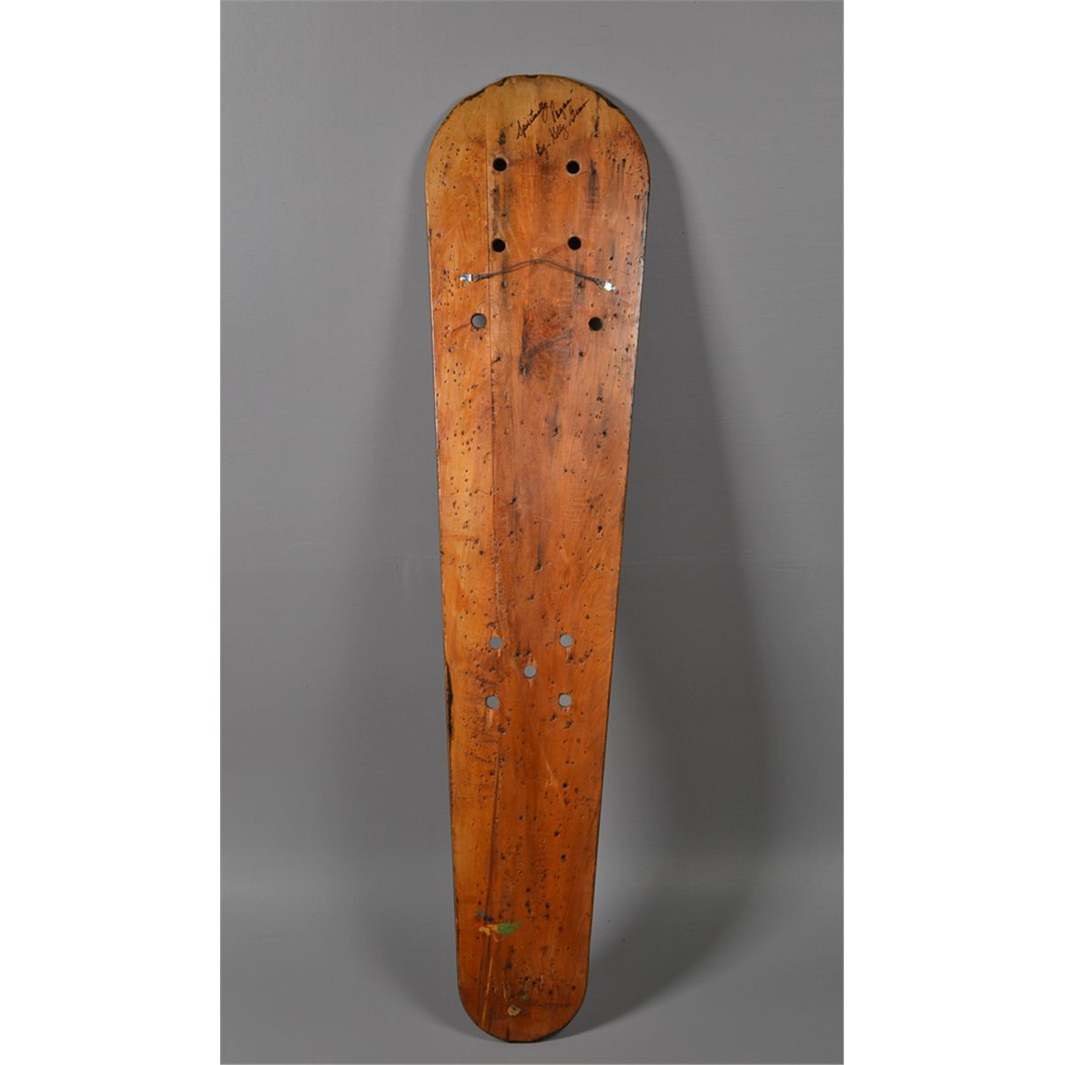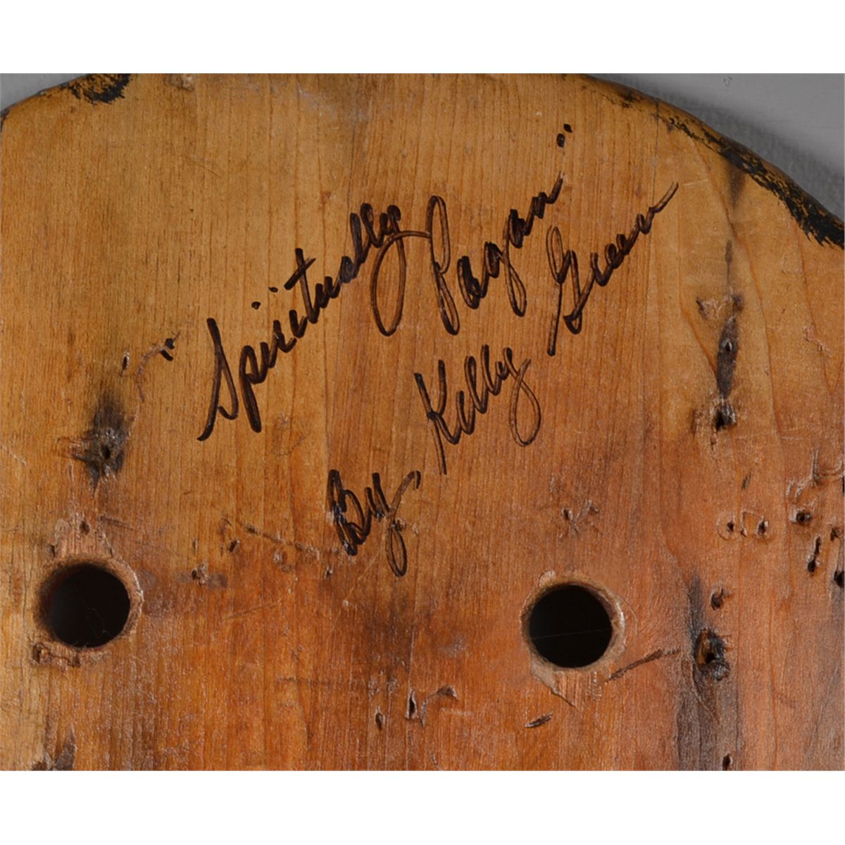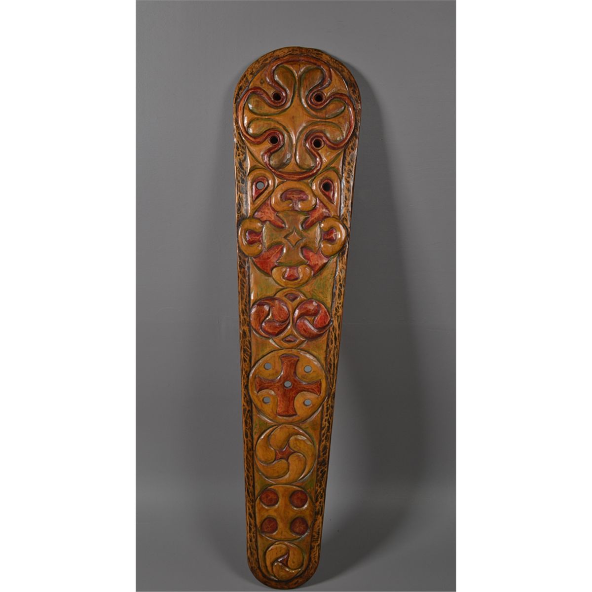 Titled, "Spiritually Pagan," depicting Celtic designs in low relief painted in green, red and black. Titled, signed and brief description of colors and/or subject matter en verso. Kelly Green, (20th century), Canada, is known for board carvings made from barnwood and construction beams. 58" L x 13.5" W. Circa 20th century. Private collecton Gregory, MI.