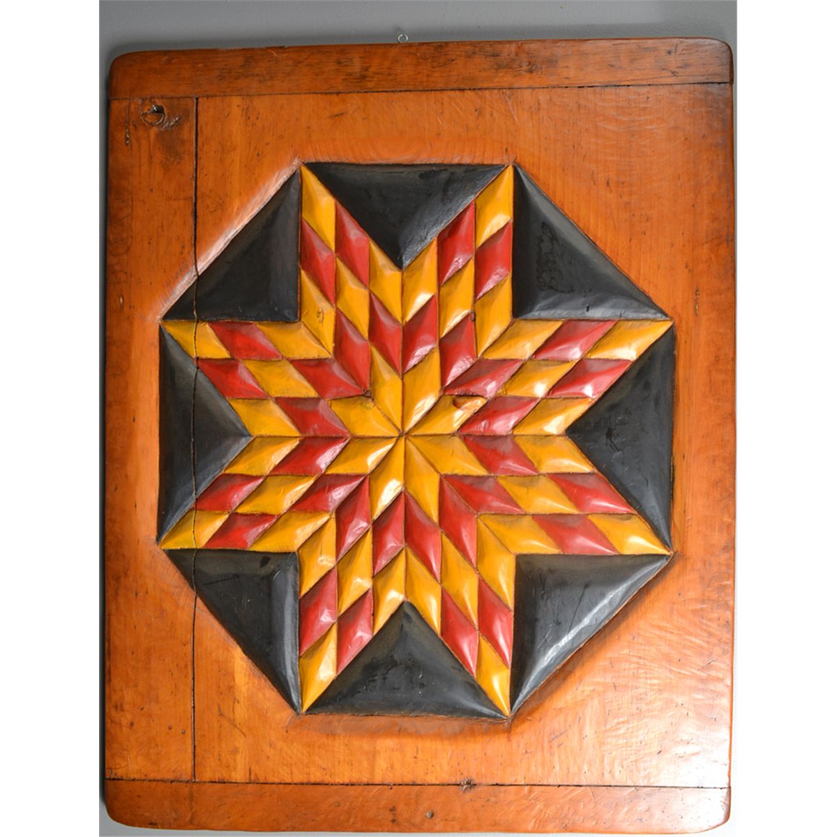 Titled "Decorative Board #9," depicting a low relief carving of Star of Betheleham in night sky, painted red, yellow and black. Titled, signed and brief description of colors and/or subject matter en verso. Kelly Green, (20th century), Canada, is known for board carvings made from barnwood and construction beams. 30" H x 24.5" W. Circa 20th century. Private collection Gregory, MI.