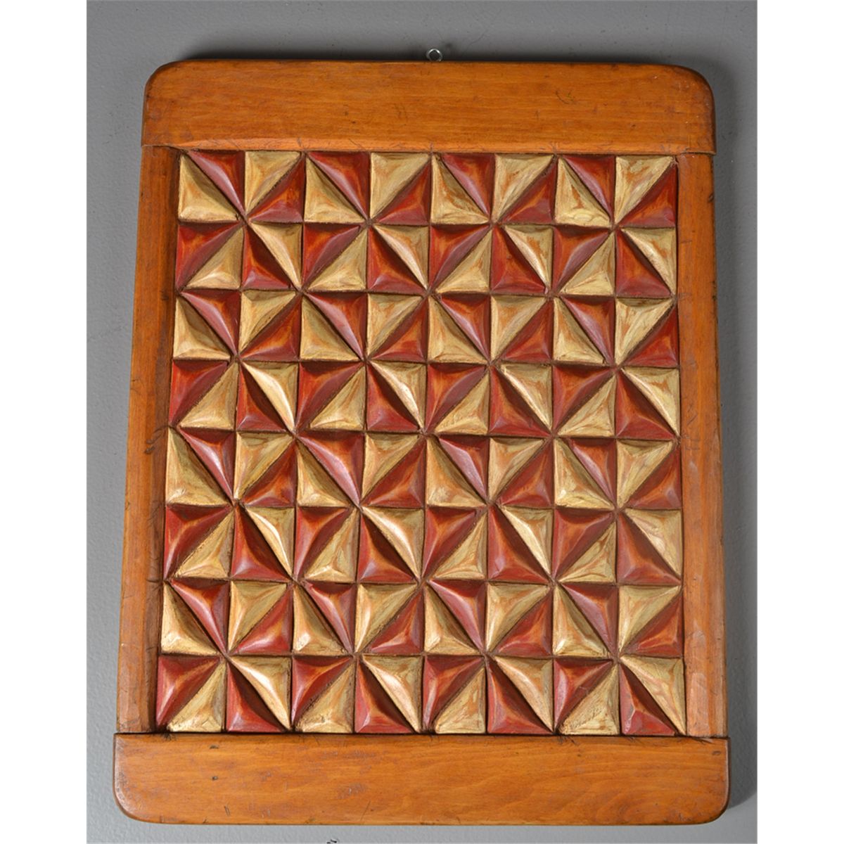 Titled, "Decorative Board #7," carved in low relief of whirlygigs, painted red and white. Titled, signed and brief description of colors and/or subject matter en verso. Kelly Green, (20th century), Canada, is known for board carvings made from barnwood and construction beams. 18" H x 13.75" W. Circa 20th century. Private collection Gregory, MI.
