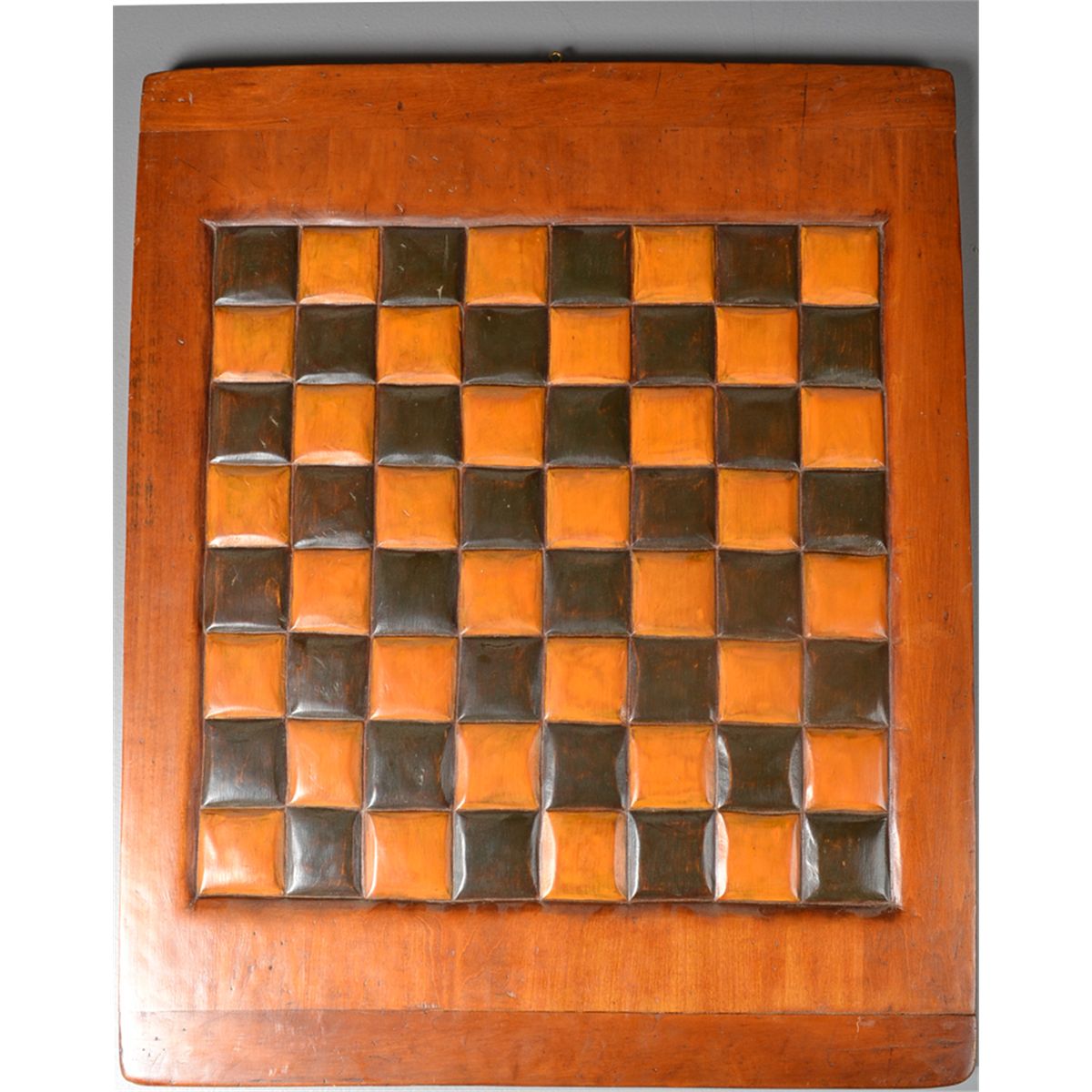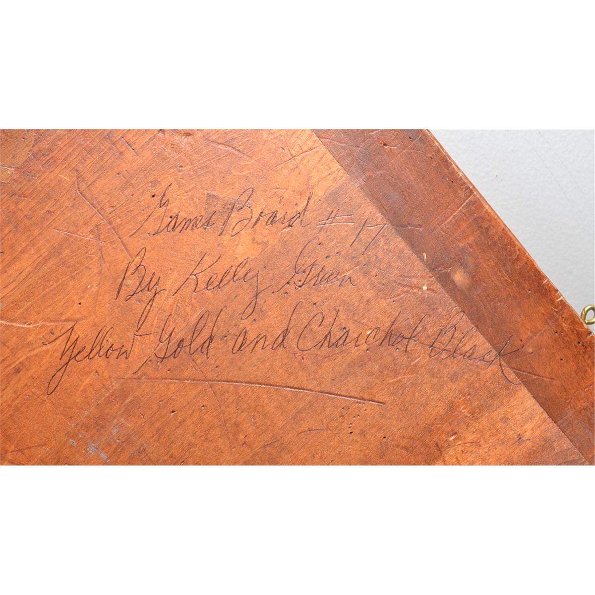 Titled, "Game Board #17," depicting a low relief carving of a game board in yellow gold and charcoal black. Titled, signed and brief description of colors and/or subject matter en verso. Kelly Green, (20th century), Canada, is known for board carvings made from barnwood and construction beams. 24.5" H x 20" W, circa 20th century. Private collection Gregory, MI.