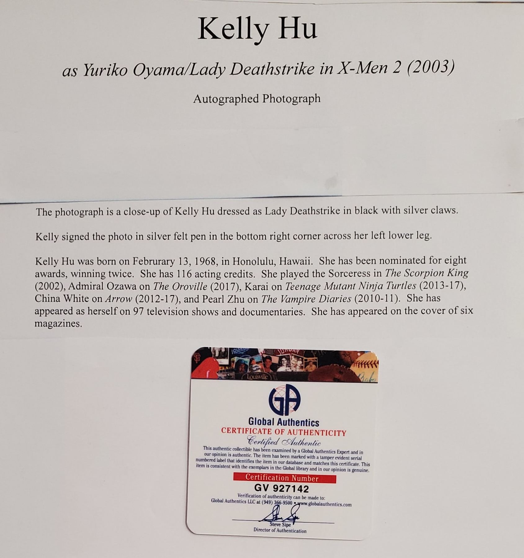 Kelly Hu. Signed 8” x 10” Photo. Lady Deathstrike. Global Authentics COA No. GV 927142