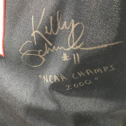 Kelly Schumacker signed University of Connecticut #11 basketball jersey made by Nike sports engineered to exact specifications of championship athletes. Signed on the front by Kelly who also wrote: NCAA champs 2000 in marker on the front of the jersey. Size 48. Kelly Schumacher, UConn's 6-foot-5 junior center, blocked a national championship-record nine shots in that NCAA championship game, including six in the first 20 minutes.
