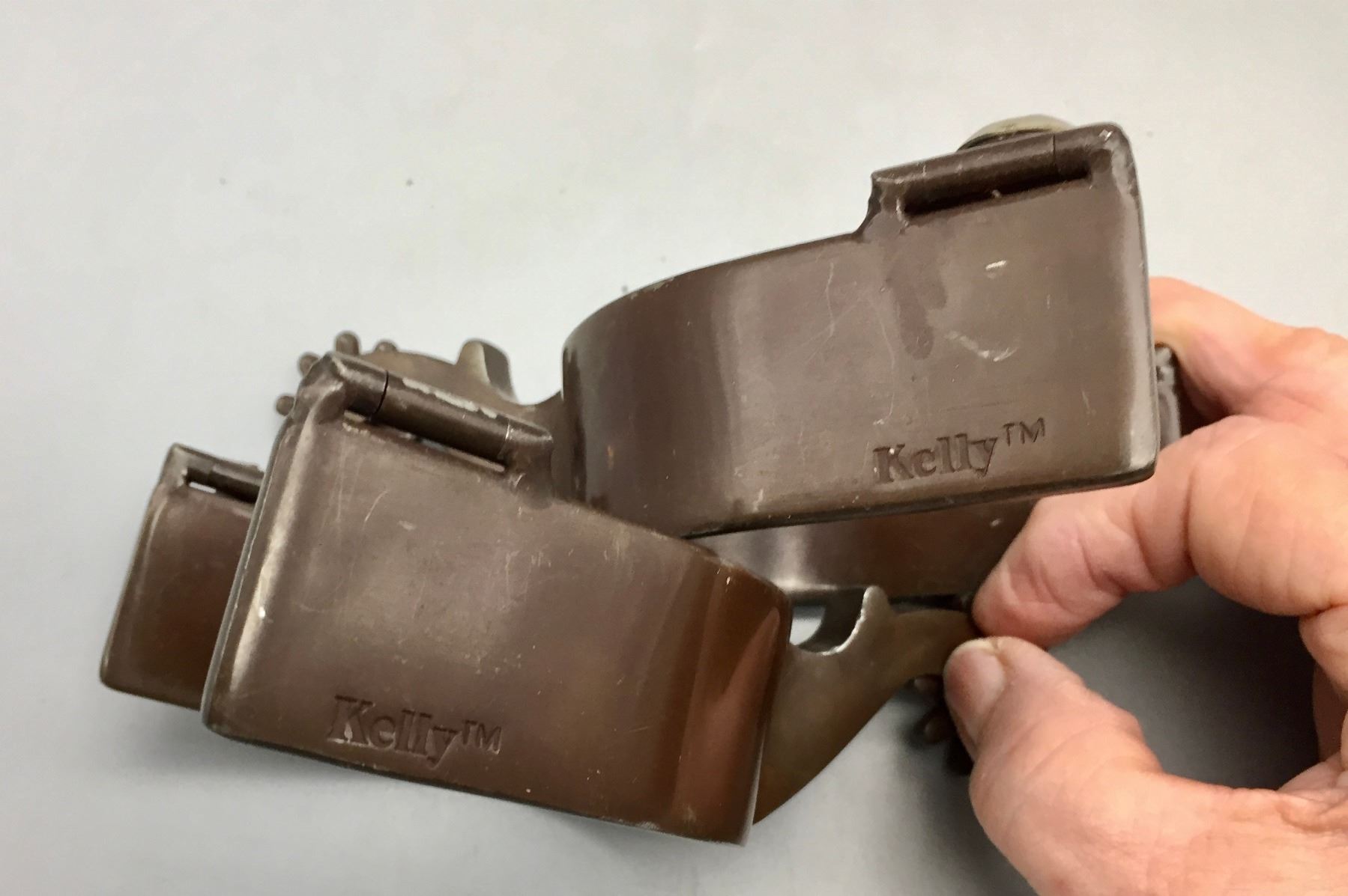 Description: For sale in this lot is a pair of Kelly marked, single mounted spurs featuring a star with other designs. Maker: Kelly. Approx. Age: Vintage. Size: Heel 3-1/8”, Shank (including rowel) 2-1/2”. Condition: Fair for their age, normal wear expected and please note that one of the spurs is missing a swing button (hanger). Please look closely at the pictures - they are an important part of our description. Shipping: There will be a $5 handling / packaging fee for shipping this lot. The actual cost of postage will be added on top of that.
