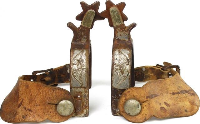 1 1/2" shanks, marked below outside button, fair condition with heavy use. Include 2 pc. leather straps. Est. 75-150