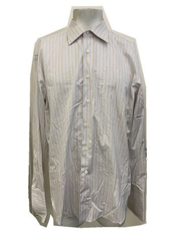 Kelsey Grammar's personally worn white with blue and orange pinstripes "Anto Beverly Hills" dress shirt. His initials and "April 2008) are sewn into the inside collar."C-25" handwritten on the inside label.