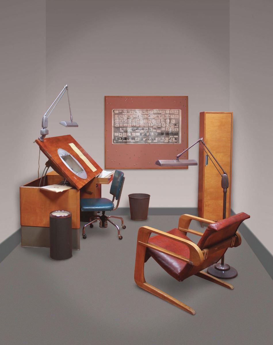 (Kem Weber, c.1938-40) Incredible set of original Disney Studio animation office furniture designed by Kem Weber. Included is an animator's desk and animator's disk, a closet (wardrobe), desk lamp, desk chair, floor lamp, extremely rare Kem Weber "Airline Chair", trash can, and ashtray. Although Animator's desks from this period occasionally show up for sale, groupings of this original Kem Weber designed furniture are so rare that we cannot recall a set such as this ever being offered for public sale. Also included with the lot is a non-Disney "storyboard" (cork bulletin board), set of studio push-pins, a Photostat storyboard reproduction by Bill Peet, one blank "x" sheet, a film scene draft and a publicity photo of animator Vance Gerry. An incredible and piece of Disney Studio history.