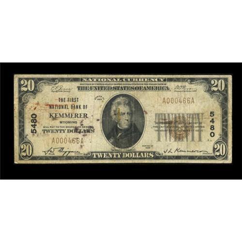 <B>Kemmerer, WY</B></I> - $20 1929 Ty. 1 <B>The First NB</B></I> Ch. # 5480<BR> Some stains are noticed on this example from a popular state. <B>Very Good</B></I>.<BR><I>From The Kansas City Collection.</B></I><BR><BR><b>Shipping:</b> Coins & Currency (<a target="_blank" href="http://www.heritageauctions.com/common/shipping.php">view shipping information</a>)