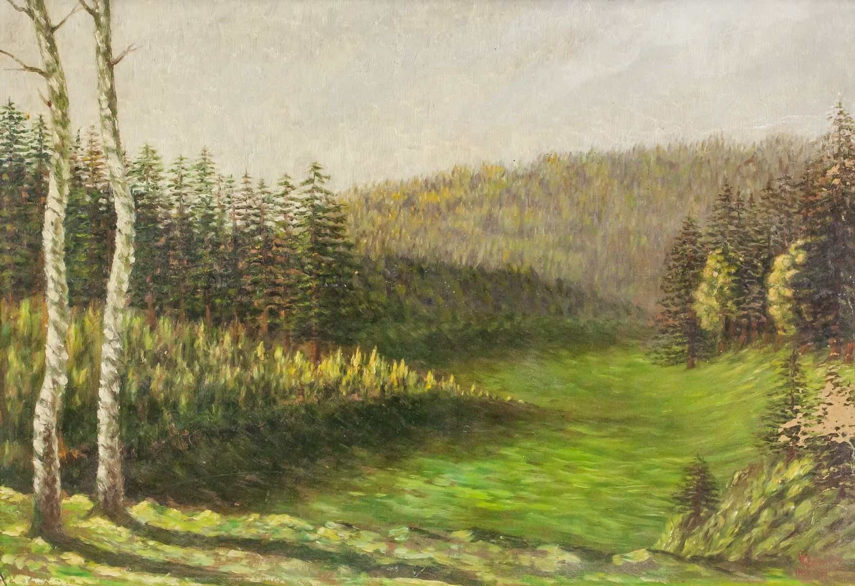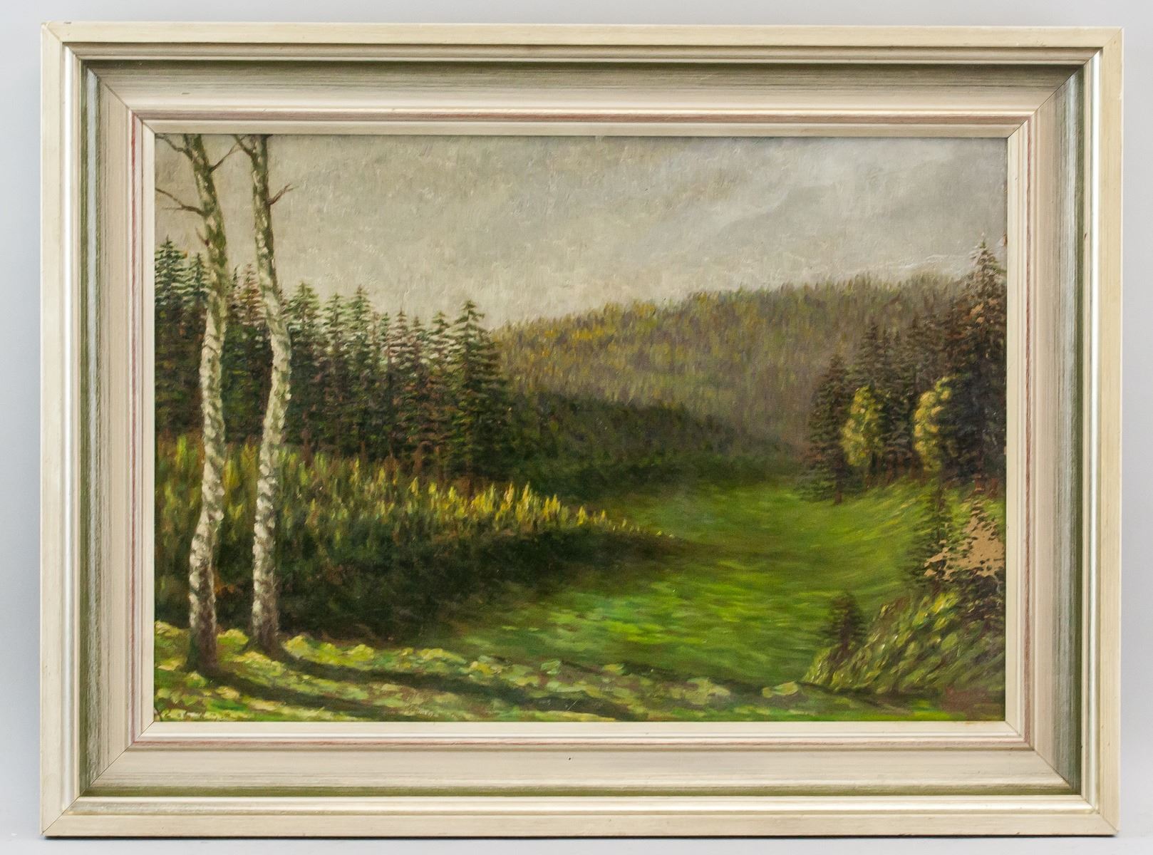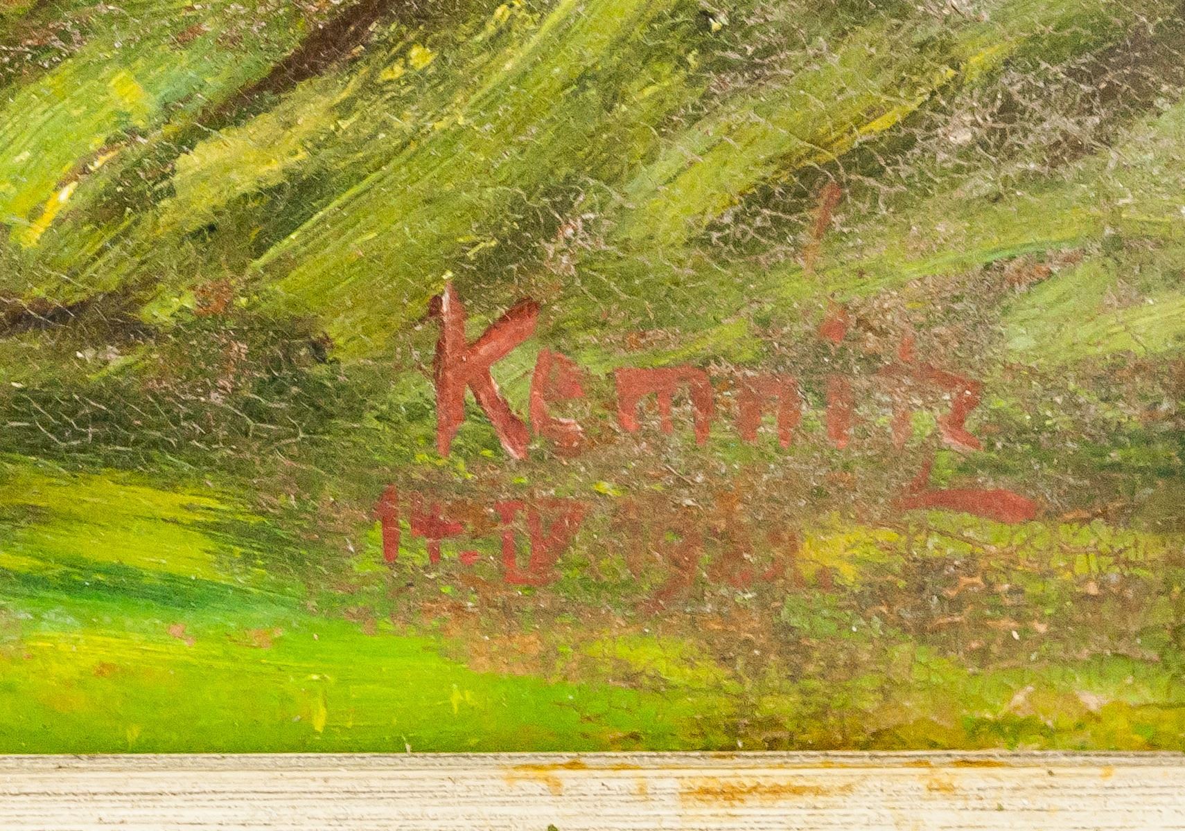 Oil on board, framed. Featuring landscape scene of a wide trail through the woods. Signed "Kemnitz" on the bottom right corner with "14.IV.1982" inscribed beneath. 36.5 x 53.5 cm (14.25 x 20.75 in), Frame: 51 x 68 cm (20 x 26.75 in). PROVENANCE: This lot carries limited provenance from a Private German collection