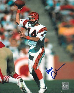 Ken Anderson was drafted 67th overall in the 1971 NFL Draft by the Bengals. He would become one of the most accurate short-range passers in the league, and was extremely effective at rushing the ball for a quarterback. Ken is considered to be one of the first quarterbacks to run what would become known as the "West Coast Offense." Ken Anderson has hand signed this Cincinnati Bengals 8x10 Photo. NSD Hologram and Certificate of Authenticity from Athlon Sports.