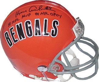 Ken Anderson was drafted 67th overall in the 1971 NFL Draft by the Bengals. He would become one of the most accurate short-range passers in the league, and was extremely effective at rushing the ball for a quarterback. Ken is considered to be one of the first quarterbacks to run what would become known as the "West Coast Offense." Ken Anderson has hand signed this Cincinnati Bengals Replica TB Mini Helmet with dual stats- 81 NFL MVP & 81 NFL OPOY inscriptions . MAB Hologram and Certificate of Authenticity from Athlon Sports.