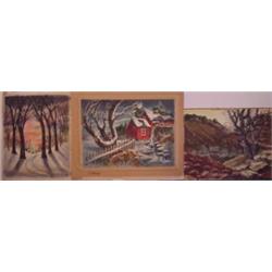 OUTDOOR GENRE THEMES, 1930's to 1940's, three watercolors on paper and board, sizes 25 x 20" to 20 x 28", two signed, with old tape, glue, and registration marks associated production & publication otherwise in fairly good condition, in condition as received by artist's estate. (3) STARTING BID $20. ESTIMATE $20 TO $1000