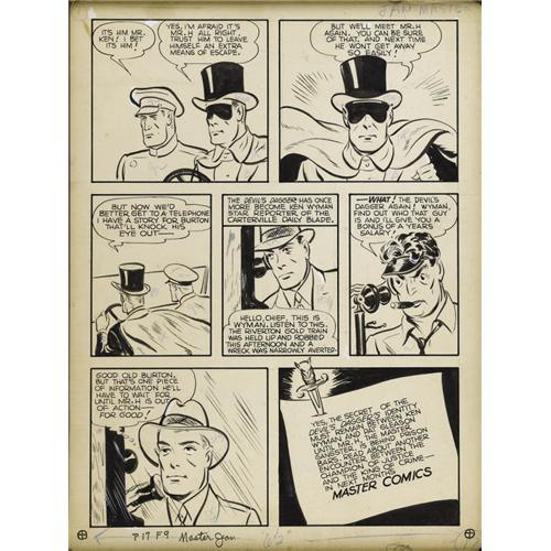 <B>Ken Battefield (attributed) - Master Comics #10, Devil's Dagger page 10 Original Art (Fawcett, 1940).</B></I> The Devil's Dagger is a character right out of the pulps and old-time radio shows. In this page from the thrilling conclusion to "Mr. H.'s Gold Grab," the Devil's Dagger assumes his secret identity as Ken Wyman, star reporter for the <B>Daily Blade.</B></I> Golden Age pages have a certain charm that can't be duplicated. This page has an image area of 13" x 18", the art has been framed, and is in Very Good condition.<I>From the collection of Patrick Marchbanks.</B></I>. <BR><BR><B>Important notice:</B> Heritage usually auctions material at the rate of 200-250 lots per hour. On some occasions eBay Live bid software or the Internet may not be able to keep up with the pace of the auction. We recommend placing a realistic absentee bid now as insurance to avoid disappointment. Occasionally the auctioneer may eliminate or reject an eBay Live bid, and the auctioneer may also reopen a lot after the close of the eBay live bidding (usually because we missed an audience bid), and may reject your bid even if it shows you as the winning bidder. By bidding via eBay Live, you agree that Heritage may award the lot to another bidder at its sole discretion under the circumstances described above or any other reasonable circumstances. Since eBay bids are not shown to us until we open the lot on the floor, we treat those bids just like floor bids. In most cases the floor responds before the eBay bid is presented to us, due to Internet lag time, so for consistency we have made it a policy that floor bids are always considered first over tie eBay live bids. Also please note that all Heritage lots purchased through eBay Live carry a 22.5% Buyer's Premium. Please make sure you read the Terms and Conditions before you bid. This lot is being auctioned in conjunction with a live floor auction by Heritage Auction Galleries. All final auction and invoice information will be supplied by Heritage Auction Galleries, and all other information should be considered preliminary. Lot:41001 <BR><BR><B>Winning Notification and Billing:</B> After the FINAL session in this auction is complete, Heritage will send e-mail and snail mail invoices. This process normally takes several days. All final auction and invoice information will be supplied by Heritage Auction Galleries, and all other information should be considered preliminary. <BR><BR>This auction will be conducted on a live auction floor and over the Internet through eBay Live. If you choose to place an absentee bid, please take a moment to <font color='#0000ff'><u><a href='http://pages.ebay.com/liveauctions/help/before/laabsentee.html'>learn how eBay Live absentee bidding works</a></u></font><font color='#000000'>