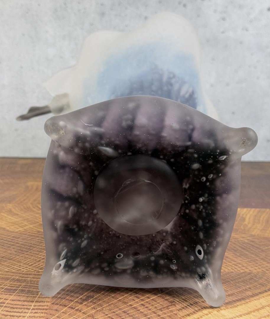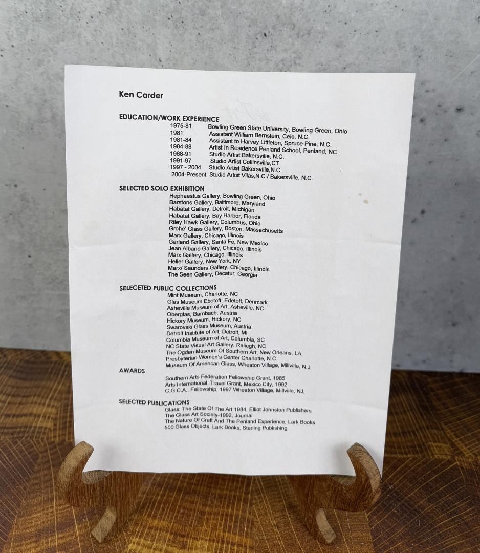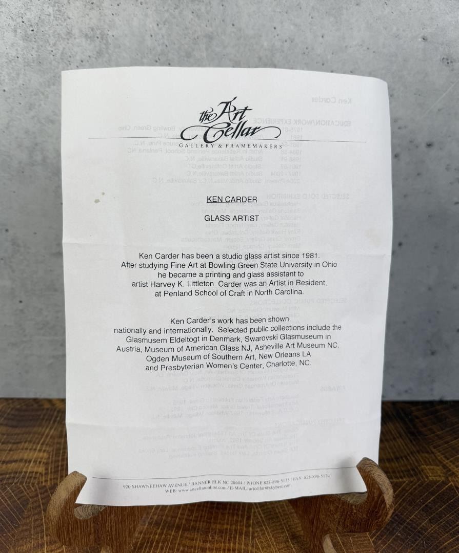 23 3/8" by 11 5/8" by 8 3/4". Ken Carder (Born 1955) is active/lives in United States. Ken Carder is known for Sculpture. After attending Bowling Green State University in Ohio as an art student, Ken moved to North Carolina in 1981 to pursue his interest in working with glass. There he became an assistant to Harvey Littleton until becoming a full time, studio artist, when he became an Artist in Residence at the Penland School of Craft in 1984. Since then he has continued to work with glass as well as with other mediums and has maintained various studios in North Carolina and Connecticut (1990-1997). His work has been exhibited internationally and is in numerous private and public collections. He lives near Boone in the mountains of western North Carolina and shares a studio with his wife ceramic artist and educator Lisa Stinson.