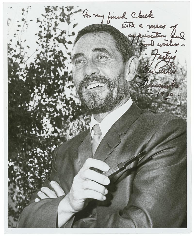 Glossy 8 x 10 photo of a well-dressed Curtis holding his pipe, signed and inscribed in black felt tip “For my friend Chuck, with a mess of appreciation and good wishes. ‘Festus’ Ken Curtis. ‘Gunsmoke’ 1970.” A couple of creases and surface marks, otherwise fine condition.