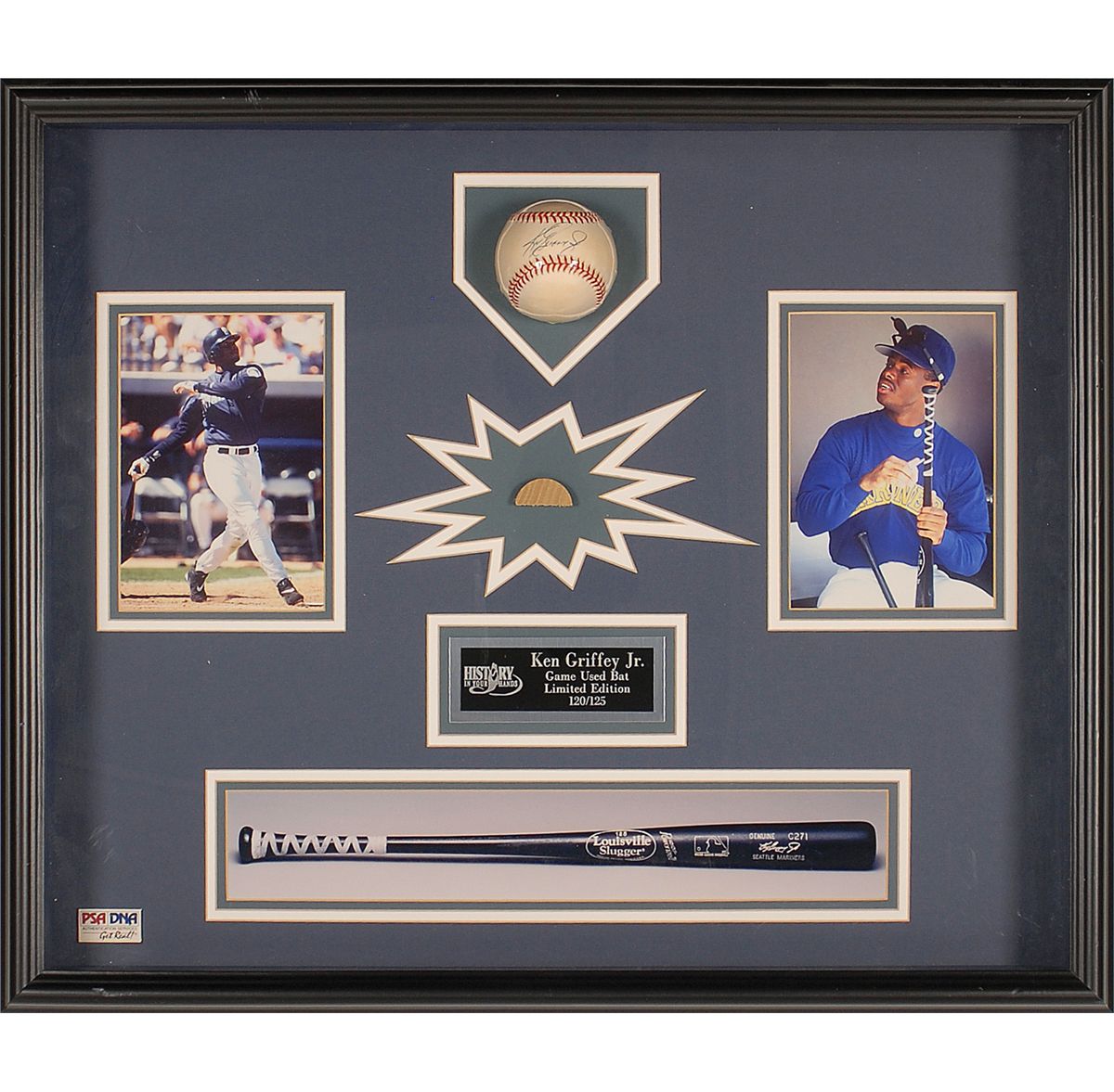 Limited edition PSA/DNA display consisting of a baseball signed on the sweet spot in blue ballpoint, #120/125, nicely shadowboxed and framed with a small cross-cut section of one of Griffey, Jr’s, game-used bats, along with three photos, to an overall size of 25.5 x 21.5. In fine condition, with mild toning to the ball. Oversized.