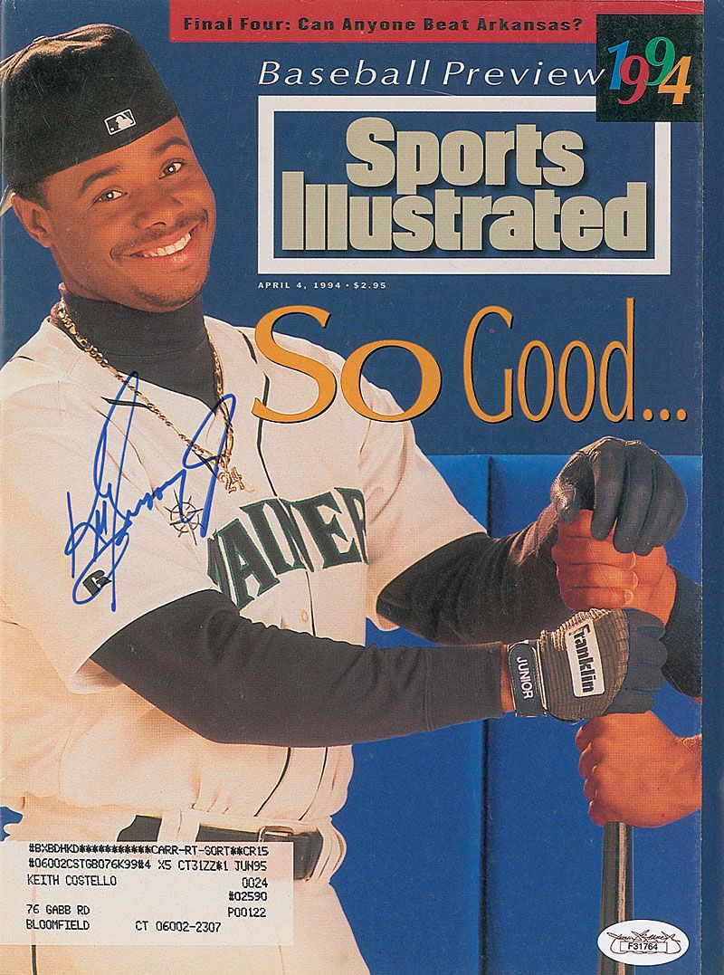 Sports Illustrated magazine, dated April 4, 1994, featuring Ken Griffey, Jr. and Mike Piazza on the fold-out cover, signed on the front cover in blue felt tip by Griffey. In fine condition, with a James Spence authentication label affixed to lower corner of cover. Accompanied by a certificate of authenticity from JSA.