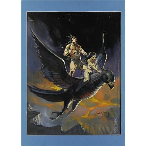 <B>Ken Kelly - "Blood Brothers of Gor" Preliminary Paperback Cover Painting Original Art (1982).</B></I> Ken Kelly created this large color preliminary for his cover painting to the DAW science fiction novel <B>Blood Brothers of Gor</B></I>, which depicts a Native American warrior and the requisite sexy, nearly-naked girl, riding atop the back of a great bird-creature. The prelim is interesting in that it differs in several details from the finished piece, notably the orientation of the bird's feet, and the position of the warrior's left arm. Kelly used an interesting technique in that he seems to have taped a sheet of art paper to a larger board with masking tape, and then used the entire board as a canvas, even painting over the taped areas; this has led to some small paint loss along the upper edge, but overall the art is in Very Good condition. The piece measures 15" x 20". A copy of the paperback novel is also included. <BR><BR><B>Important notice:</B> Heritage usually auctions material at the rate of 200-250 lots per hour. On some occasions eBay Live bid software or the Internet may not be able to keep up with the pace of the auction. We recommend placing a realistic absentee bid now as insurance to avoid disappointment. Occasionally the auctioneer may eliminate or reject an eBay Live bid, and the auctioneer may also reopen a lot after the close of the eBay live bidding (usually because we missed an audience bid), and may reject your bid even if it shows you as the winning bidder. By bidding via eBay Live, you agree that Heritage may award the lot to another bidder at its sole discretion under the circumstances described above or any other reasonable circumstances. Since eBay bids are not shown to us until we open the lot on the floor, we treat those bids just like floor bids. In most cases the floor responds before the eBay bid is presented to us, due to Internet lag time, so for consistency we have made it a policy that floor bids are always considered first over tie eBay live bids. Also please note that all Heritage lots purchased through eBay Live carry a 22.5% Buyer's Premium. Please make sure you read the Terms and Conditions before you bid. This lot is being auctioned in conjunction with a live floor auction by Heritage Auction Galleries. All final auction and invoice information will be supplied by Heritage Auction Galleries, and all other information should be considered preliminary. Lot:41001 <BR><BR><B>Winning Notification and Billing:</B> After the FINAL session in this auction is complete, Heritage will send e-mail and snail mail invoices. This process normally takes several days. All final auction and invoice information will be supplied by Heritage Auction Galleries, and all other information should be considered preliminary. <BR><BR>This auction will be conducted on a live auction floor and over the Internet through eBay Live. If you choose to place an absentee bid, please take a moment to <font color='#0000ff'><u><a href='http://pages.ebay.com/liveauctions/help/before/laabsentee.html'>learn how eBay Live absentee bidding works</a></u></font><font color='#000000'>