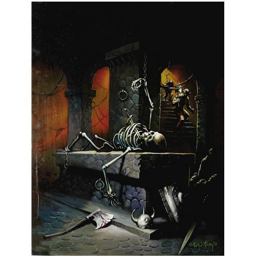 <B>Ken Kelly - Conan Hologram Card Oil Painting, Group of 9 (FPG, 1992).</B></I> Ken Kelly ranks among the best of Conan's many illustrators. For the three FPG Conan Hologram cards "Dungeon of Doom" (H1), "Swamp Peril" (H2), and "Eve of Destruction" (H3), Kelly executed nine full-color oil on masonite scenes that were used to create the levels of depth. On one of the cards he commented about the process, "Creating three separate paintings that make up one holographic image is a lot like building a complicated puzzle. All the images must piece together to make the final product work." These illustrations range in overall size from 11.5" x 14" to 18" x 24", and the art averages Excellent condition. Two sets of the hologram cards are also included in this lot.<BR><BR><b>Shipping:</b> Large Flat (<a target="_blank" href="http://www.heritageauctions.com/common/shipping.php">view shipping information</a>)