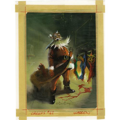 <B>Ken Kelly - Creepy #68 Preliminary Book Cover Study Original Art (Warren, 1975).</B></I> "'Twas the night before Christmas, and all through the house, little creatures were stirring, strewing bodies about!" Santa makes a bloody mess, in this cover illustration preliminary for an issue that really lives up to its title, <B>Creepy</B></I> #68! This horrific little sketch is a dark and somber representation of how Kelly visualized the final painting. Painted in washes of oil on a sheet of bristol board, the art has an image area of 7" x 9", and the condition is Excellent.