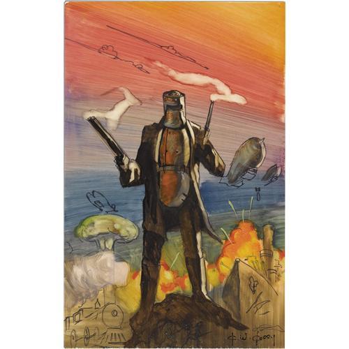 <B>Ken Kelly - "Kelly Country" Preliminary Book Cover Study Original Art (Daw, 1985).</B></I> <B>Kelly Country</B></I> is an alternate universe tale in which the famous bandit, Ned Kelly, takes over the entire continent of Australia. Written by the most successful science fiction writer in Australian history, A. Bertram Chandler, this book is Chandler's most clearly Australian novel. When Ken Kelly was hired to illustrate the cover of the Daw book, he created several preliminary sketches to flesh out what he would paint in the final art. This vibrant sketch is a loose and colorful representation of how Kelly visualized the final painting. Painted in washes of oil unified in ink on a 10.75" x 16.75" illustration board, the condition is Excellent.