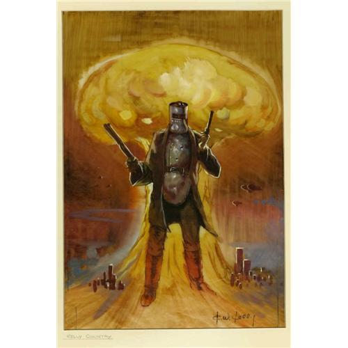 <B>Ken Kelly - "Kelly Country" Preliminary Book Cover Study Original Art (Daw, 1985).</B></I> A. Bertram Chandler's novel, <B>Kelly Country</B></I>, is an alternate history in which Australian folk hero, Ned Kelly, leads a successful revolution against British authority, and the result is that Australia becomes a world power. Throughout a career spanning over 30 years, Ken Kelly has garnered an international reputation as a master painter of sword and sorcery/heroic fantasy. Kelly’s signature is synonymous with dynamic illustrations that transport the viewer to exotic, enchanted locales and primal battlefields. Kelly creates a vivid image of "The Man in the Iron Mask" in this preliminary oil sketch of the cover. The art measures 12.5" x 17.5" and the condition is Excellent.