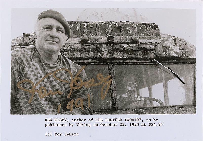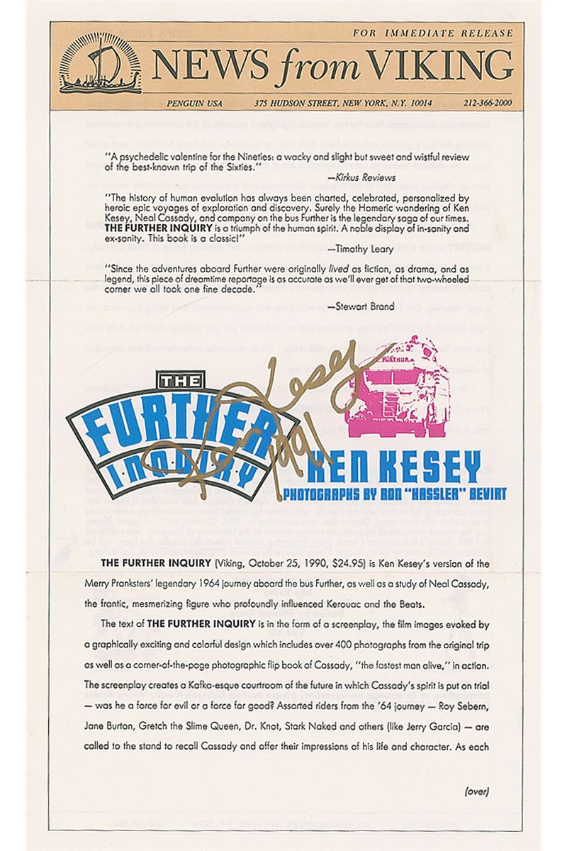 Two items: glossy 7 x 5 promotional photo of Kesey after publishing The Further Inquiry, signed in gold ink, “Ken Kesey, 1991”; and a publicity pamphlet for the book, 8.5 x 14, signed in the same manner. In overall fine condition.