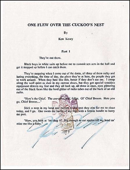 Souvenir typescript of the opening from One Flew Over the Cuckoo’s Nest, one page, 8.5 x 11, signed in black ink and blue felt tip, “Ken Kesey, 1995,” adding a Native American stamp. In part: “They’re out there. Black boys in white suits up before me to commit sex acts in the hall and get it mopped up before I can catch them.” In fine condition.
