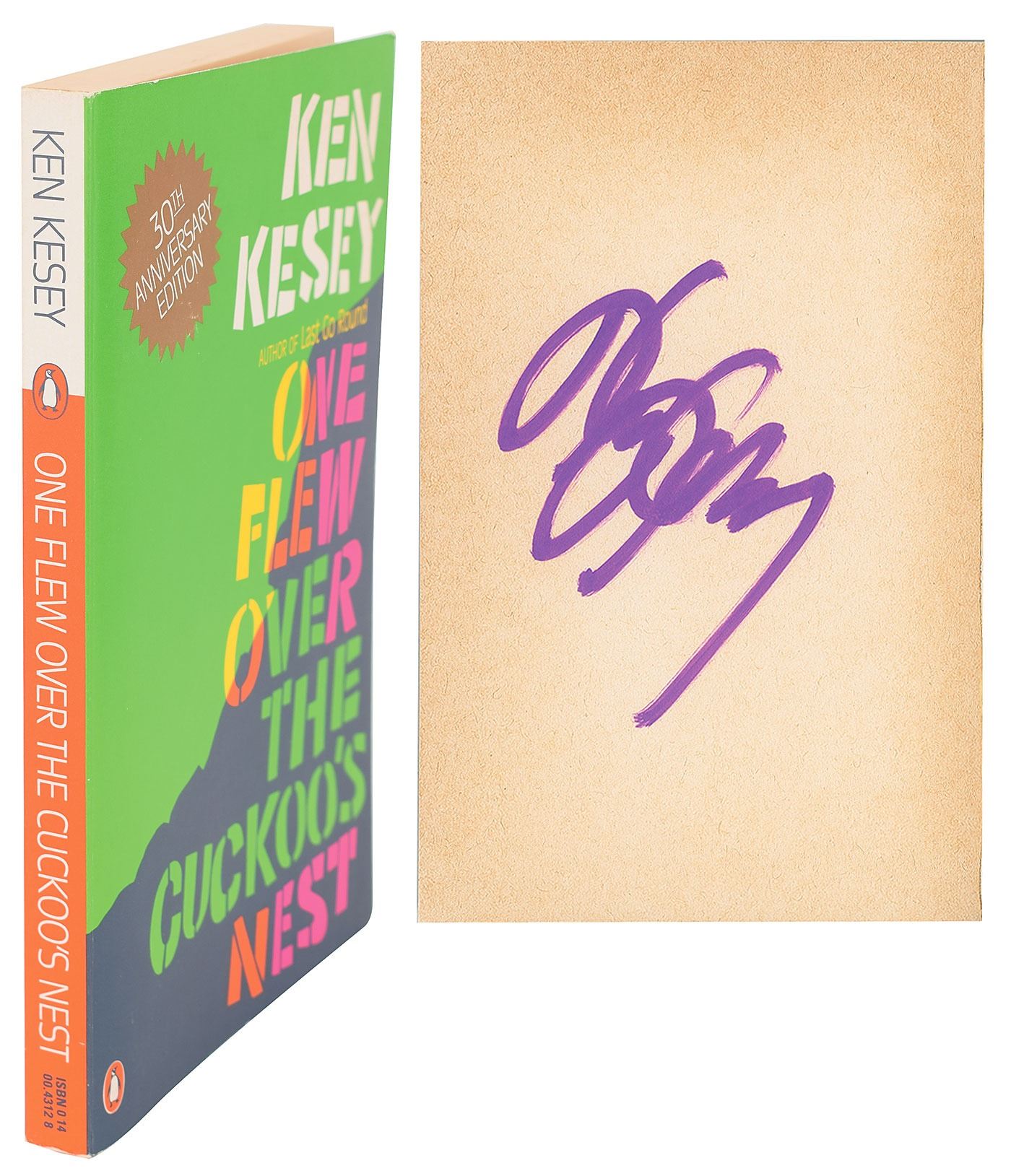 Signed book: One Flew Over the Cuckoo's Nest. 30th anniversary edition. NY: Penguin, 1992. Softcover, 5 x 7.75, 311 pages. Signed inside the front cover in thick purple ink, "Ken Kesey." In fine condition.