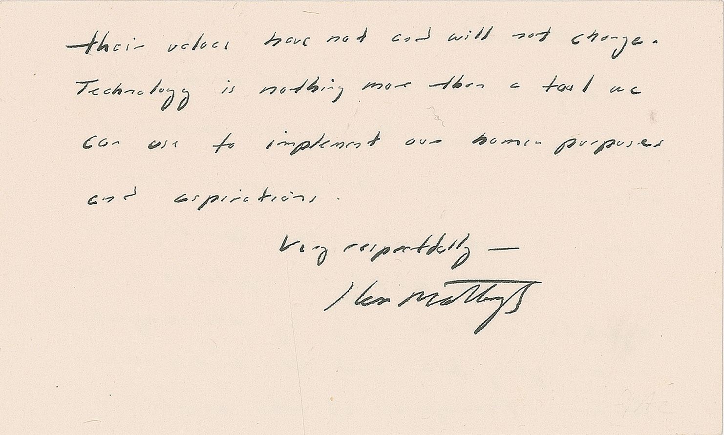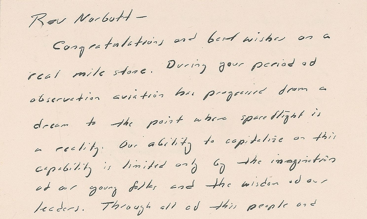 ALS, one page both sides, 5 x 3, no date. Letter recognizing success in aviation, in full: "Congratulations and best wishes on a real milestone. During your period of observation aviation has progressed from a dream to the point where spaceflight is a reality. Our ability to capitalize on this capability is limited only by the imagination of our young folks and the wisdom of our leaders…Technology is nothing more than a tool we can use to implement our human purposes and aspirations." In fine condition.