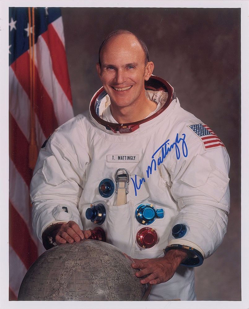 Color glossy 8 x 10 photo of Mattingly in his white space suit, signed in blue felt tip. In fine condition.