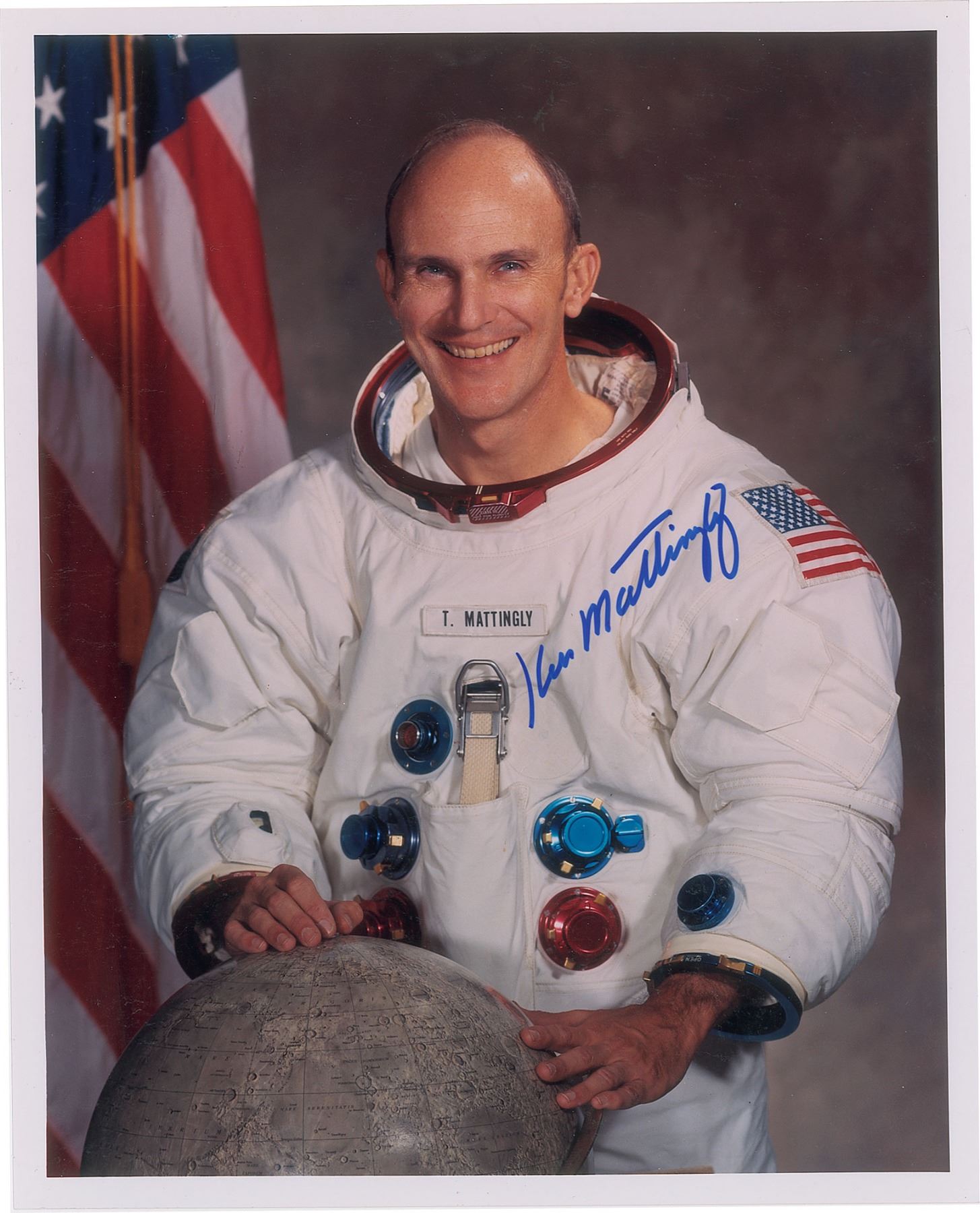 Color satin-finish 8 x 10 photo of Mattingly posing in his white space suit with a lunar globe, boldly signed in blue felt tip. In fine condition, with a couple of light bends to the top.