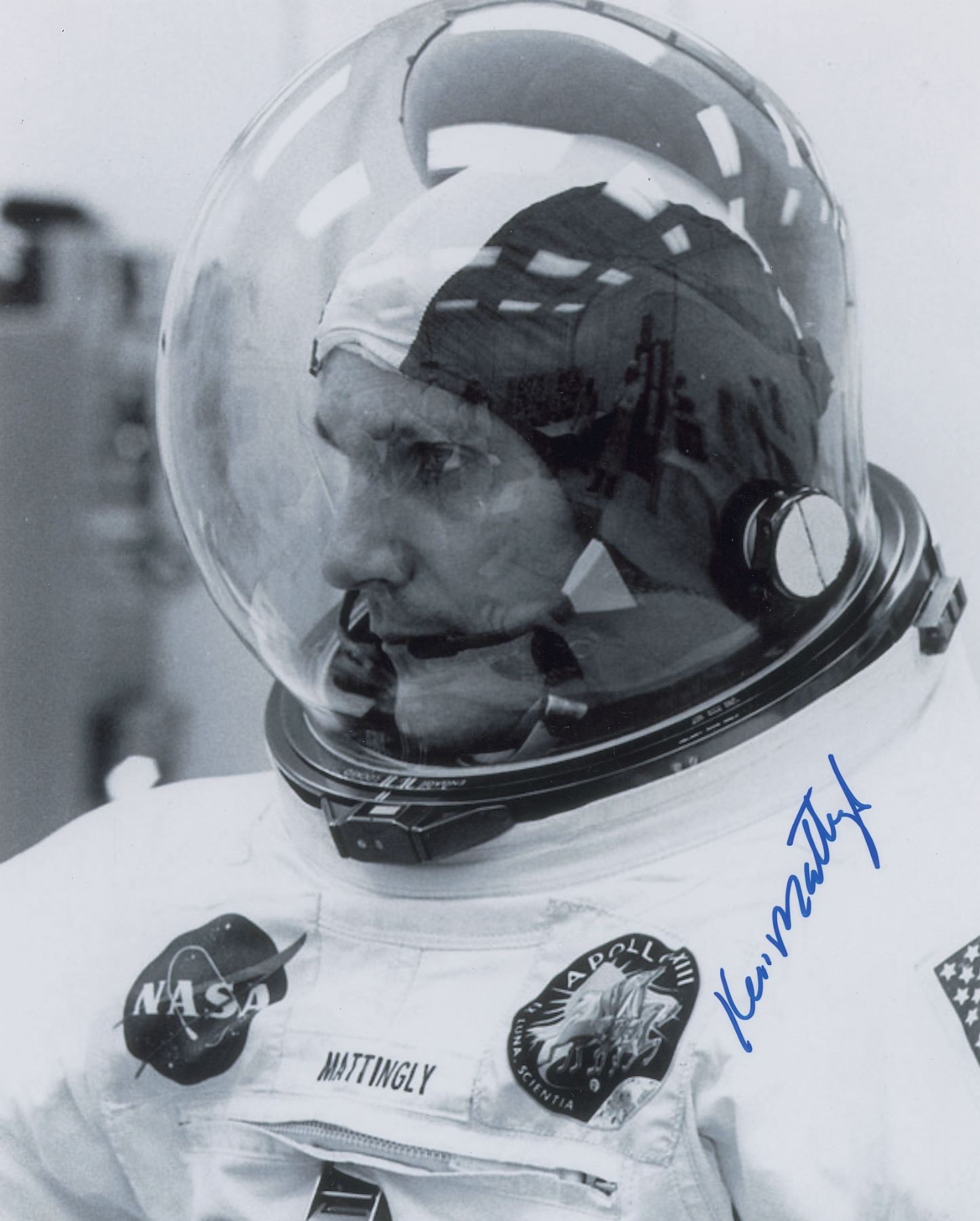 Glossy 8 x 10 close-up photo of Ken Mattingly wearing his space suit with helmet and 'Snoopy' cap during an Apollo 13 training activity, signed in blue felt tip. In fine condition, with two small surface gouges.