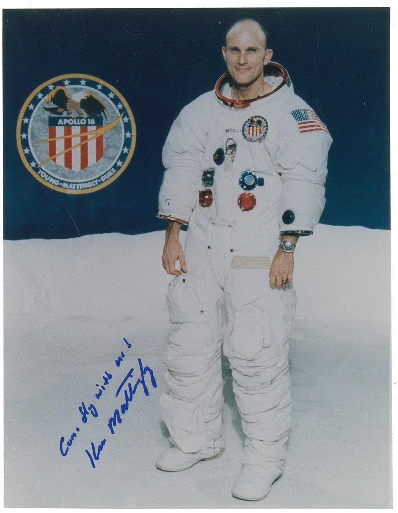 Color satin-finish 8 x 10.25 photo of Mattingly posing in his spacesuit, signed in blue felt tip, “Come fly with me! Ken Mattingly.” In fine condition, with light surface marks and trimmed edges.