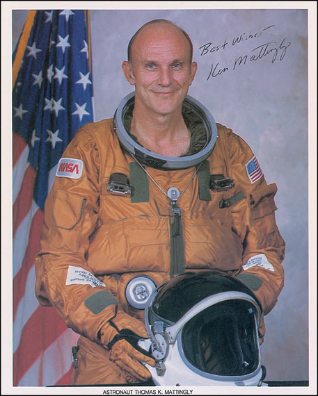 Color 8 x 10 NASA photo of Mattingly posing in his beige spacesuit, signed in black ink, “Best wishes—Ken Mattingly.” In fine condition.