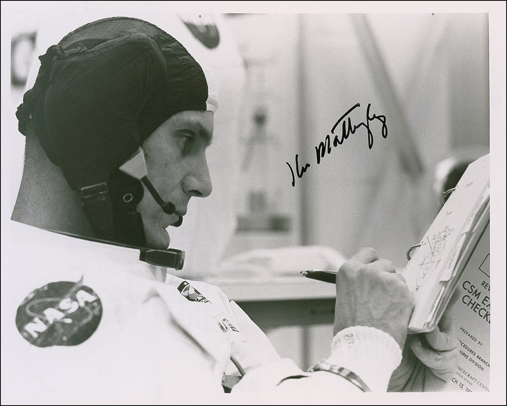Glossy 10 x 8 NASA photo of Mattingly making notes prior to his Apollo 16 Countdown Demonstration Test, signed in black felt tip. In fine condition, with a few trivial corner tip creases.