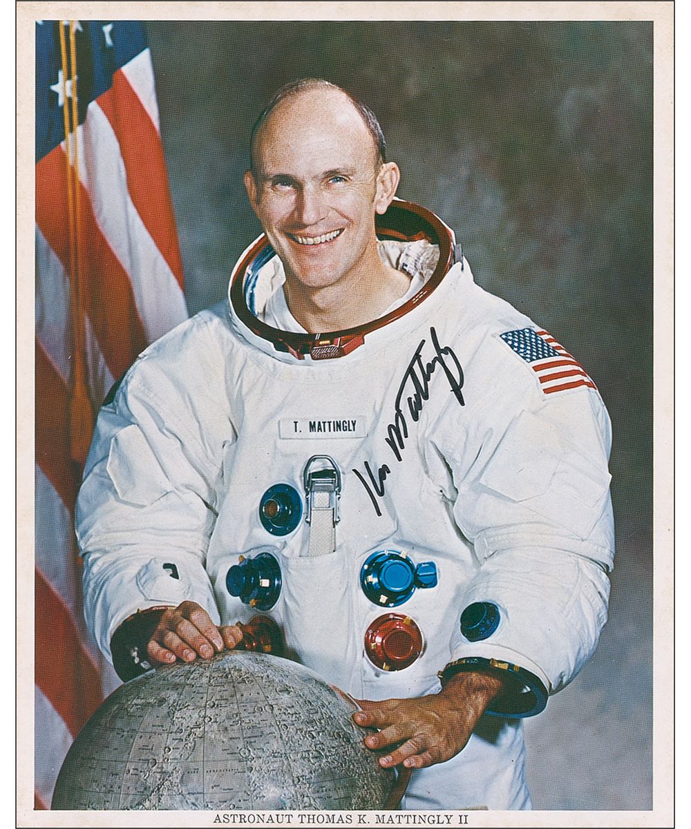 Uncommon color 8 x 10 NASA photo featuring Mattingly in his seldom seen white spacesuit, signed in black felt tip. In fine condition, with light toning along the edges and a crease to the top right corner.