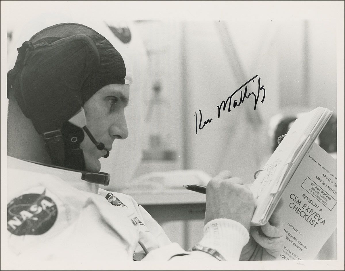 Vintage glossy 10 x 8 NASA photo of Mattingly going over his flight checklist before the Apollo 16 Countdown Demonstration Test, signed later in black felt tip. In fine condition, with a few scattered light creases and surface marks.