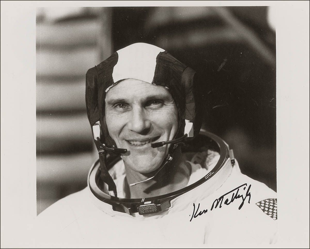Vintage glossy 10 x 8 NASA photo of Mattingly in his space suit before the Apollo 16 mission, signed later in black felt tip. In fine condition.