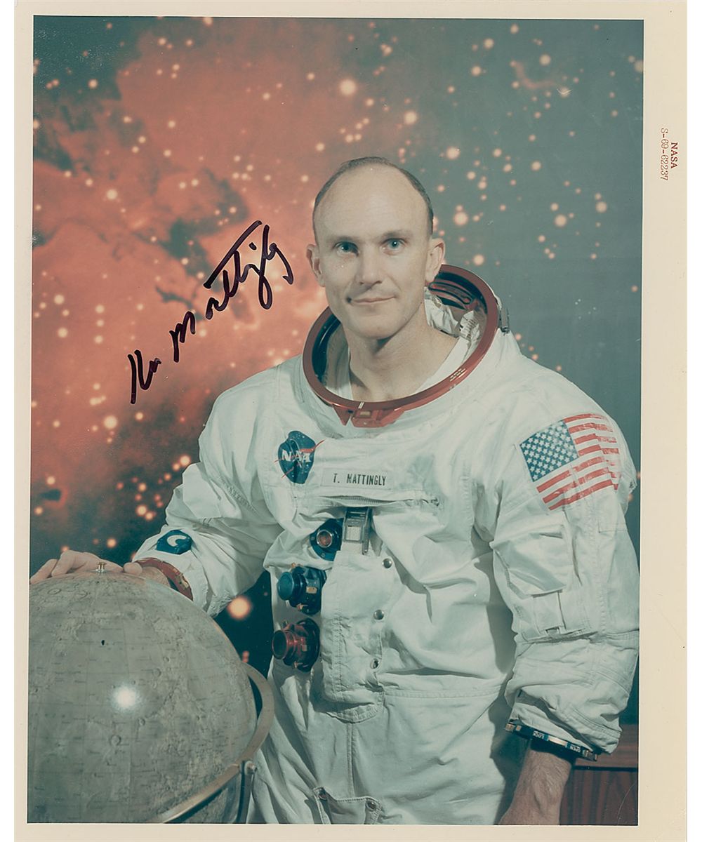 Very uncommon color glossy 8 x 10 ‘red-numbered’ NASA photo of of Mattingly posing in his seldom-seen white space suit, signed in black felt tip. In fine condition.