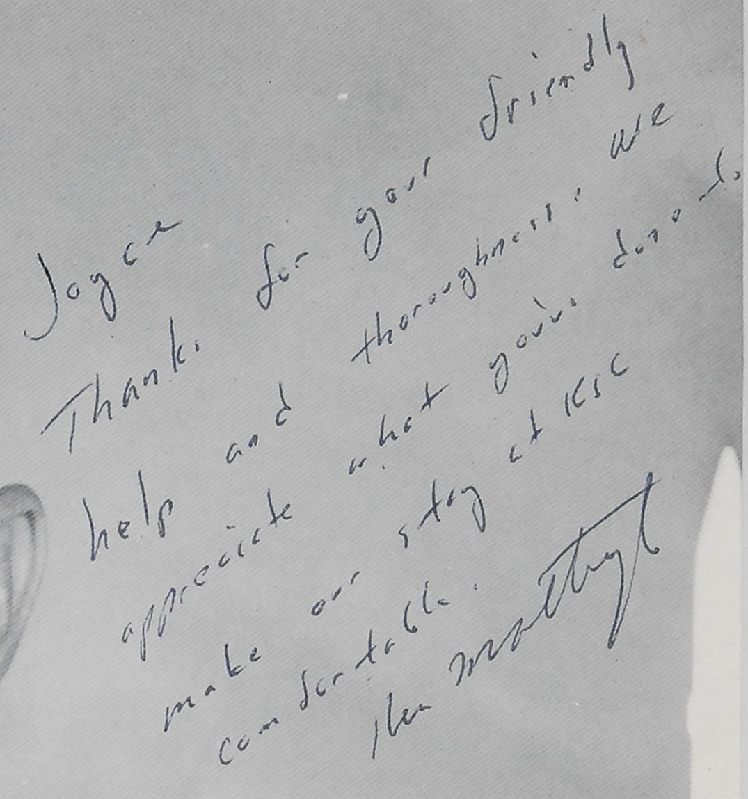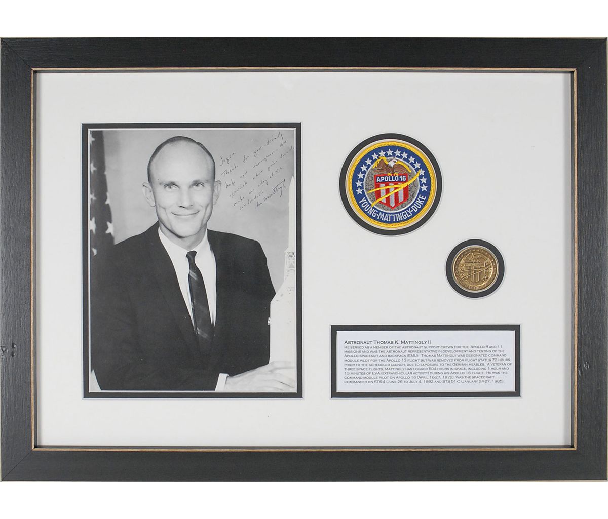 Official NASA 8 x 10 lithograph of Mattingly posing with a model, signed and inscribed in black ink, “Joyce, Thanks for your friendly help and thoroughness. We appreciate what you’ve done to make our stay as KSC comfortable, Ken Mattingly.” Double-matted and framed with an Apollo 16 mission patch, medallion, and printed biography to an overall size of 20.75 x 15.5. In fine condition. Inscribed to longtime NASA employee Joyce Abrams, who was a senior member of the ground support team.