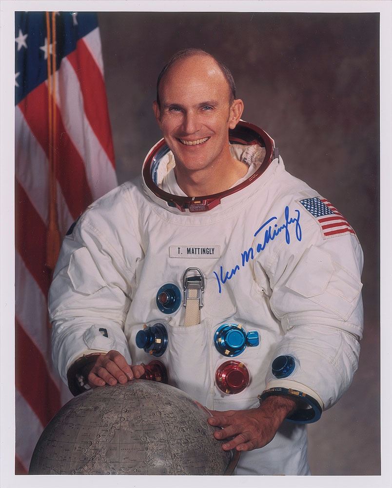 Color semi-glossy 8 x 10 photo of Mattingly posing in his white space suit, signed in blue felt tip. In very fine condition. An appealing portrait of the original CM pilot for the Apollo 13 mission.