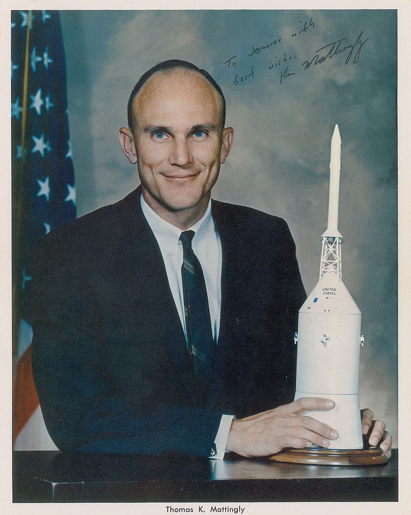 Official color 8 x 10 NASA lithograph of Mattingly posing with a spacecraft model, signed and inscribed in black ink, "To Jeanine with good wishes, Ken Mattingly.” In very fine condition. Recipient was an employee at the Los Angeles International Airport who assisted astronauts with picking up their GSA vehicles circa 1967.