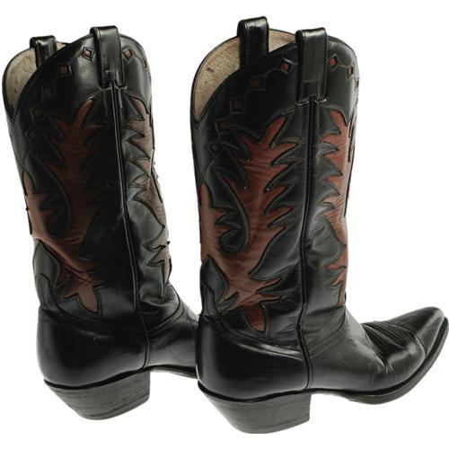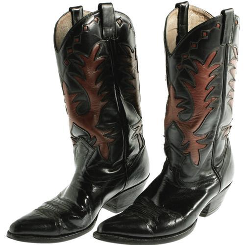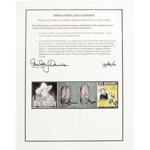 <B>Ken Maynard Boots.</B></I> A pair of hand-tooled, black leather cowboy boots with red leather flame design, owned and worn by the cowboy actor/stuntman at numerous personal appearances. In Very Fine to Excellent condition with mild wear. <I>Accompanied by a letter of authenticity.</B></I><I>From the Robert Johnson Memorabilia Collection.</B></I><BR><BR><b>Shipping:</b> Clothing, Costumes & Jerseys (<a target="_blank" href="http://www.heritageauctions.com/common/shipping.php">view shipping information</a>) <BR><BR><B>Important notice:<