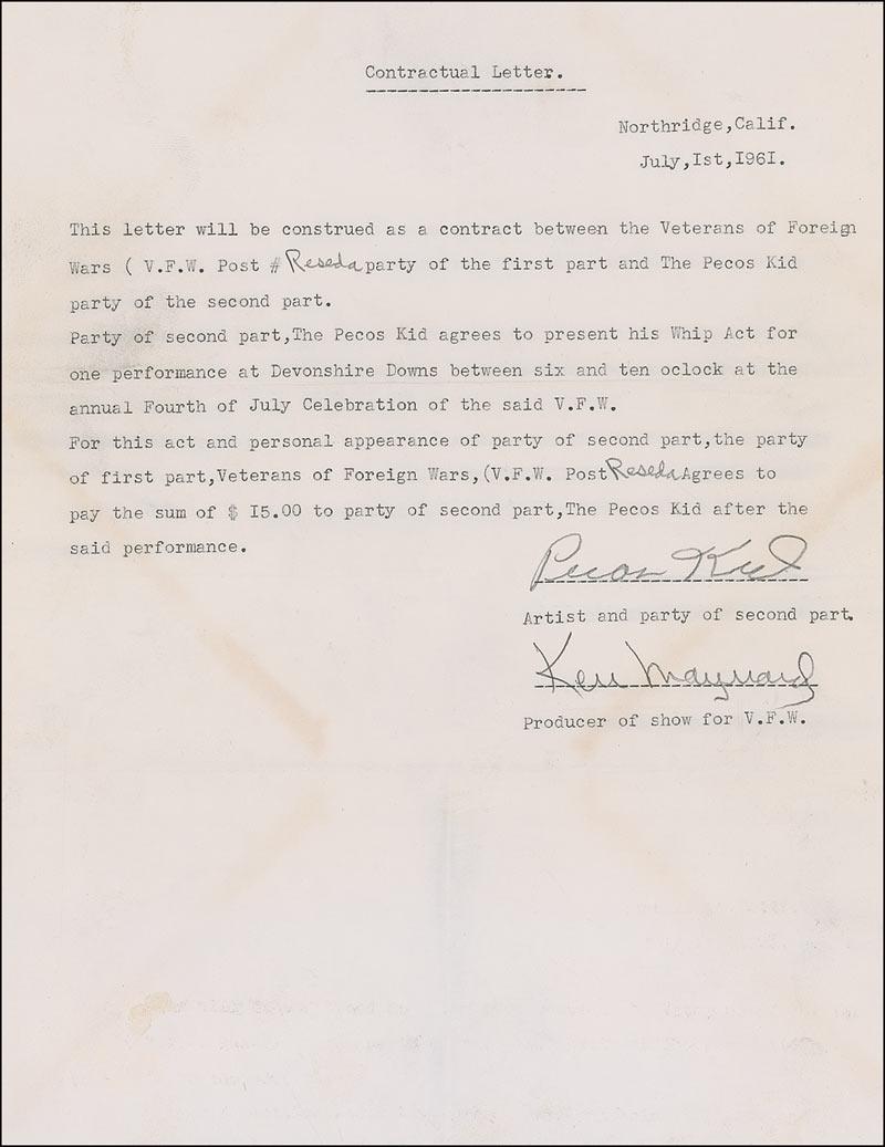 DS, signed in pencil, one page, 8.5 x 11, July 1, 1961. Agreement between Maynard and The Pecos Kid for the Kid to present his Whip Act at a VFW 4th of July celebration for the sum of $15.00. Signed at the conclusion in pencil by both Maynard and The Pecos Kid. In fine condition, with intersecting folds, and several lines of light diagonal toning, one affecting a couple letters of signature. Accompanied by the original Ken Maynard’s Wild West Circus transmittal envelope.
