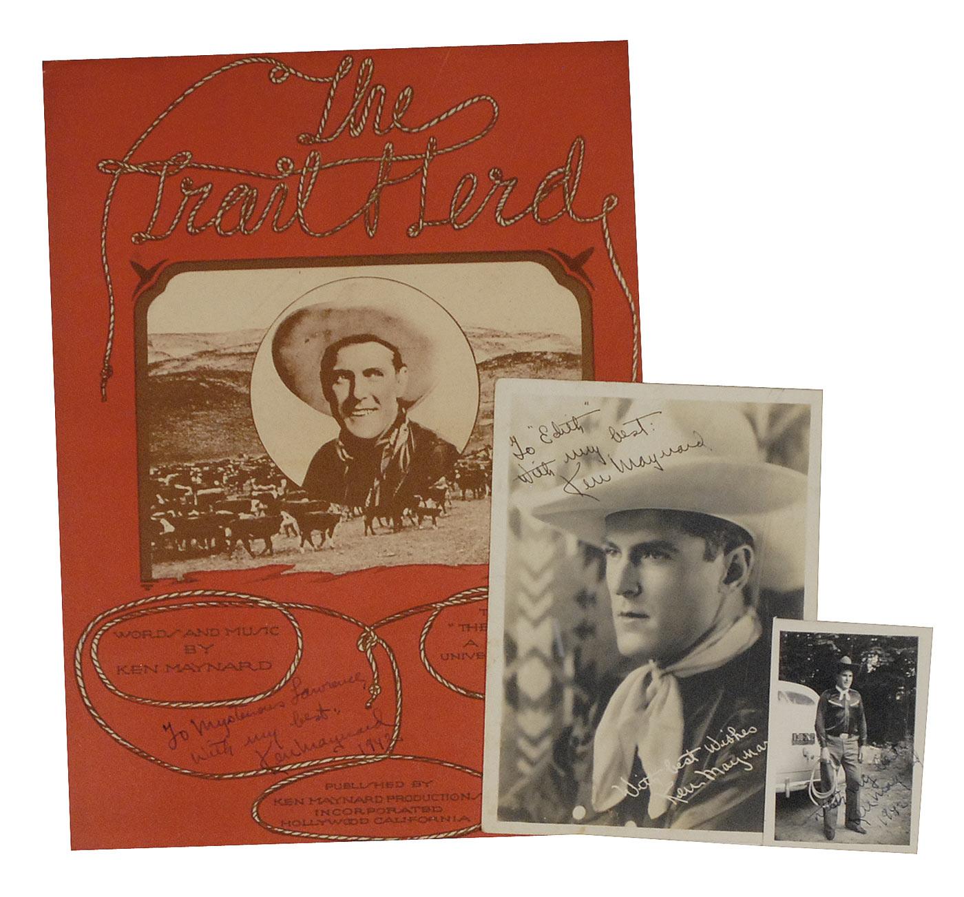 Three items: vintage matte-finish 5 x 7 photo signed and inscribed in fountain pen “To ‘Edith,’ With my best, Ken Maynard” above a printed signature; vintage glossy 2.5 x 3.5 candid signed in fountain pen “With my best, Ken Maynard, 1942”; and sheet music for the song ‘The Trail Herd,’ signed and inscribed on the front cover in fountain pen, “To Mysterious Lawrence, with my best, Ken Maynard 1942.” In overall fine condition with scattered light wrinkling and handling wear.