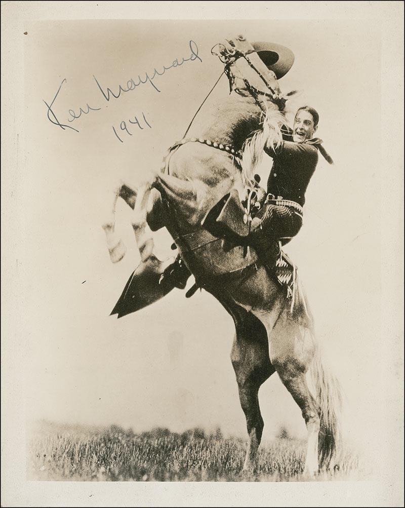 Vintage sepia matte-finish 8 x 10 photo of Maynard atop his rearing horse, signed in fountain pen, “Ken Maynard 1941.” Some scattered light surface marks and impressions, and a few stray ink marks, otherwise fine condition.