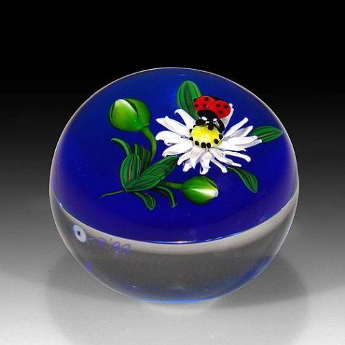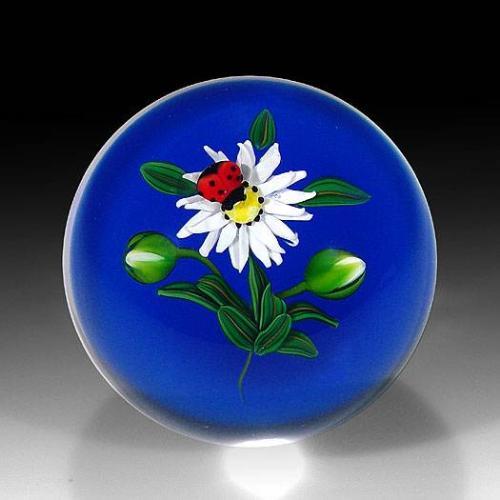Ken Rosenfeld 1999 ladybug and daisy on blue ground paperweight. A black-spotted red ladybug rests atop a white daisy, with two buds and green leaves, on translucent blue ground. Signature cane. Signed/dated. Diameter 2 1/2".