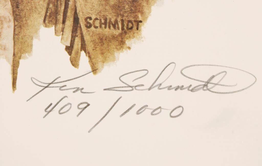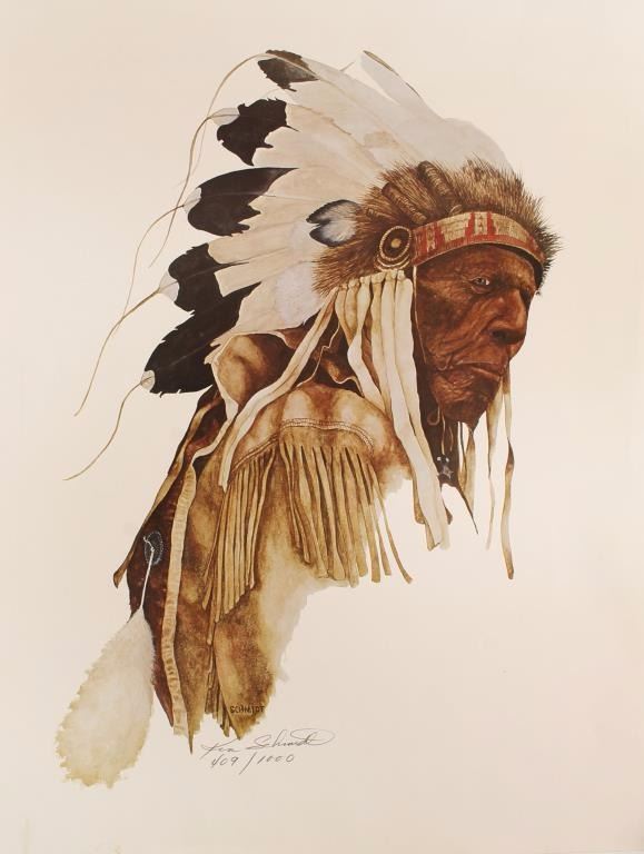 Depicting an Indian chief bust with beaded headdress, fringed buckskin jacket and white background. Print measures 20" x 27". Limited edition. Pencil signed and numbered 409/1000. Condition is good with some wrinkles and bent corner.